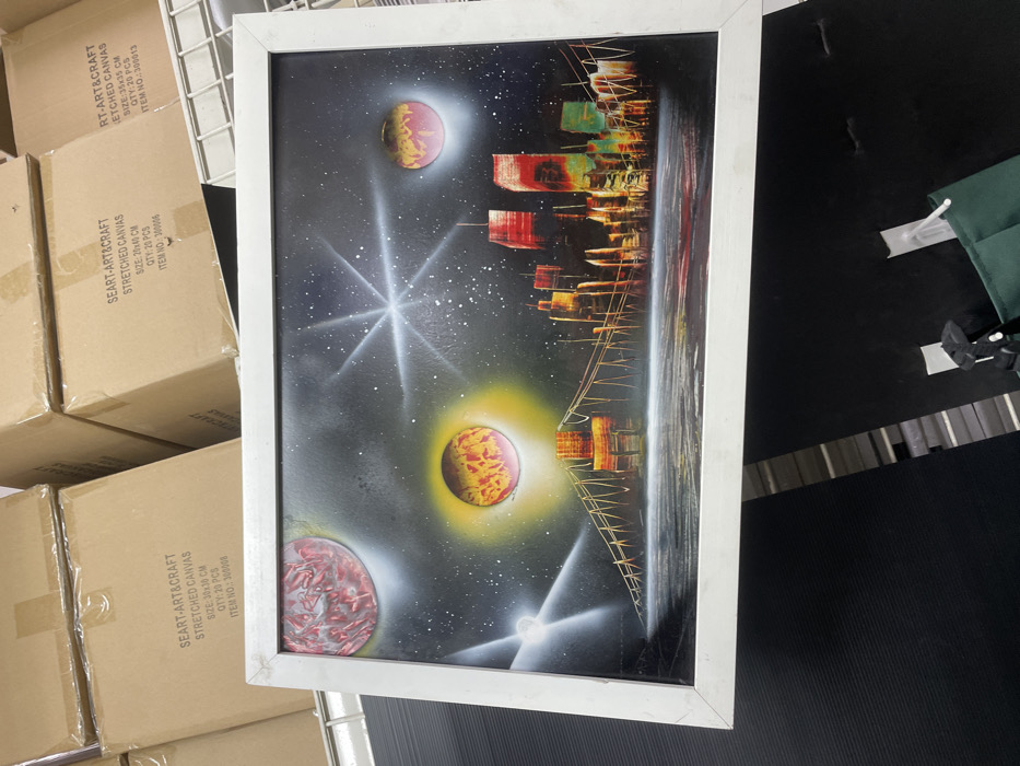 The image displays an interior scene, likely a retail or storage area of an art supply business in Kfar Saba, Israel, specifically SEART-ART&CRAFT. No individuals are visible. The central subject is a framed artwork, oriented horizontally, resting on a dark surface. The white wooden frame encloses a spray-painted depiction of a cosmic cityscape. The artwork features a dark, star-filled sky with a prominent white starburst in the upper center-right and a bright white orb emitting light rays on the far left. Three celestial bodies are depicted: a reddish-grey textured planet in the upper left, a yellow-orange textured planet with a vivid yellow glow in the mid-left, and a reddish-yellow textured planet with a lighter glow in the upper right. Below the celestial scene, an illuminated cityscape with various buildings displaying vertical streaks of red, orange, yellow, and green light is visible across a body of water. A suspension bridge with prominent cables, also illuminated, connects the left side to the cityscape. Reflections of the city lights are visible on the water's surface, which transitions to a lighter, frothy-like texture in the immediate foreground of the painting. In the background, behind the framed artwork, numerous stacked brown cardboard boxes are visible. Multiple boxes bear printed labels including "SEART-ART&CRAFT", "STRETCHED CANVAS", and specific dimensions such as "SIZE: 30X30 CM", "SIZE: 20X40 CM", and "SIZE: 35X35 CM", along with quantities (e.g., "QTY: 20 PCS") and item numbers (e.g., "ITEM NO: 300008", "ITEM NO: 300006", "ITEM NO: 300013"). These boxes confirm the context of art supplies. Below the framed artwork, a dark, textured surface is present, potentially a floor or counter. On the bottom right, a segment of a dark green fabric item is visible, alongside two white plastic clips or ties. To the left of these objects, a vertical pattern of alternating light and dark stripes suggests a shelf or grating.