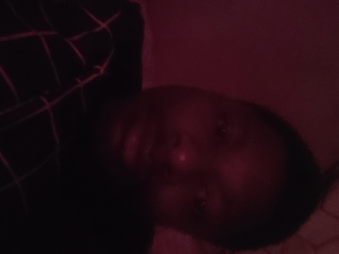 A person's face is dimly lit with a reddish hue, likely from a light source. The individual appears to be lying down, as the head is tilted. A dark plaid pattern is partially visible on the left side of the frame, possibly from clothing. The background is indistinct and mainly consists of red color. The overall image has a dark and somewhat grainy quality.