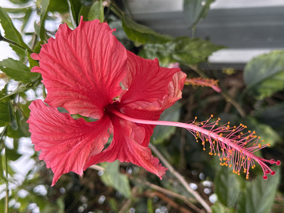 The image presents a close-up, vertical view of a single red hibiscus flower. The flower, positioned slightly left of center, features five large, broad petals of a deep red color, exhibiting slight crinkling along their edges and visible venation. Lighter pinkish-red tones are observable on the undersides of some petals, particularly towards the lower right. A prominent, elongated pistil, colored pale pink to reddish-pink, extends downwards from the center of the flower. Numerous yellow-orange anthers on short filaments are attached along the length of this pistil, which terminates in several dark red, rounded stigmas. The background is blurred, showing green foliage, branches, and an indistinct vertical grey structure on the far right. No human or animal subjects are present. The scene depicts a botanical subject in an outdoor environment. The location is Dumbéa, France.