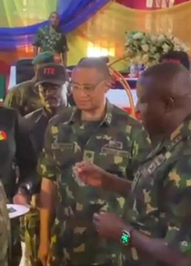 group of military officers in camouflage uniforms standing together. They appear to be in an indoor event space, decorated with yellow, blue, and red drapes. One officer is handing something small to another officer who is wearing glasses. Other officers are standing around them, some with hats and insignias. They are conversing and listening attentively. There is a table with flowers in the background.