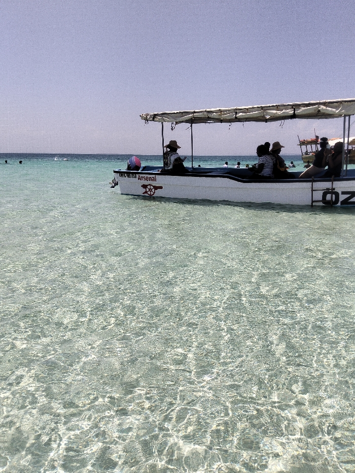 The image depicts a white, canvas-canopied boat anchored in shallow, clear, turquoise water under a light blue sky in Wasini, Kenya