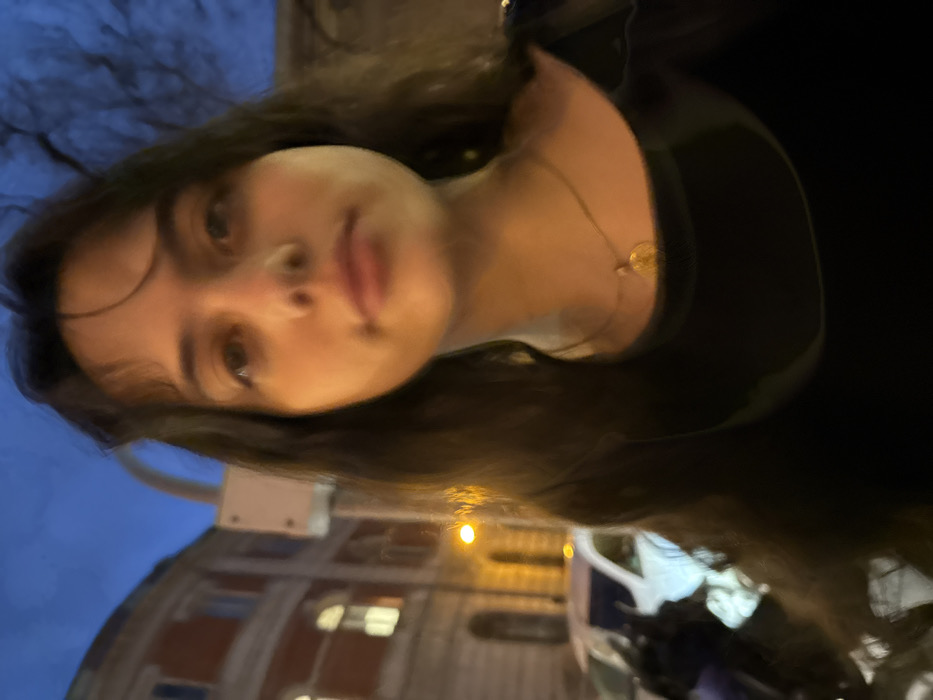 A young woman with dark hair and eyes gazes into the camera. She wears a dark top and a gold necklace. Behind her is an urban scene at dusk with a large building that has lighted windows. A white vehicle is partially visible. A street light casts a warm glow in the background. The overall composition is slightly blurred.