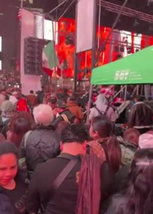 large crowd of people standing in Times Square, New York. The crowd is mostly composed of people wearing casual clothing, including jackets, hoodies, and hats. Some are wearing face masks. In the background, there is a stage set up with a Mexican flag. There are large video screens and advertising billboards visible. A green canopy is positioned to the right of the camera's point of view. The music is loud.