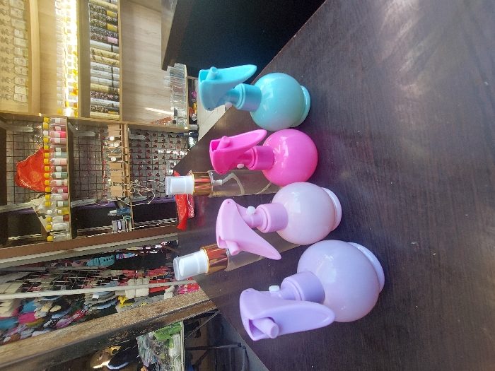 The scene is an interior view of a retail store, implied to be located in Dahiyat Qudsaiya, Syria. The primary focus is on a dark-colored countertop in the foreground, displaying five small spray bottles. Two of these are clear, cylindrical bottles with gold-colored bands and white pump spray mechanisms. The other three are spherical plastic bottles with integrated trigger sprayers: one pastel purple bottle with a matching purple sprayer, one pastel pink bottle with a matching light pink sprayer, and one bright pink bottle with a matching bright pink sprayer. A light blue-green spherical bottle with a light blue sprayer is also visible. In the background, the store environment is visible. To the left, a vertical wooden beam partially obscures a person in dark clothing. Behind this individual, a display rack holds various colorful garments, possibly undergarments or accessories. Further right in the background, multiple shelves are stocked with merchandise. A set of metal grid shelves holds numerous small clear bottles containing various colored liquids, along with a red plastic bag and smaller items resembling watches on display cards. Adjacent to these are wooden shelves densely packed with rows of small to medium-sized clear bottles, many filled with light-colored liquids, suggesting perfumes, essential oils, or cosmetic products. The lighting appears to be a mix of ambient light from the left and internal store illumination. No direct interactions or actions are depicted.