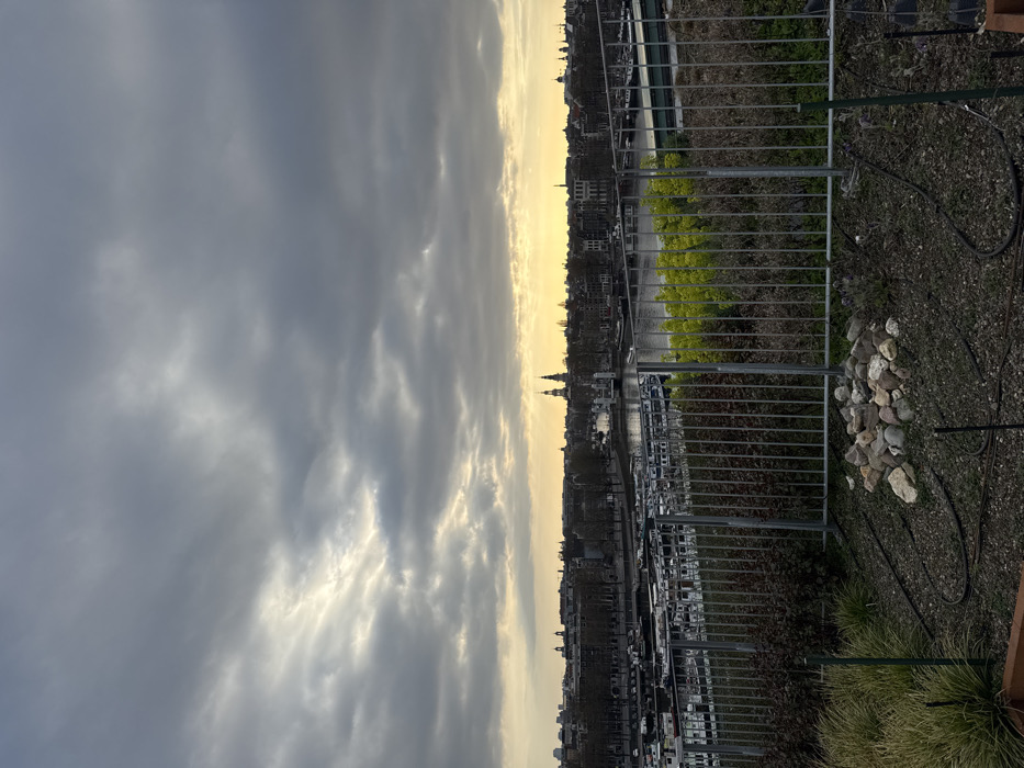 An elevated, wide-angle landscape photograph depicts an urban scene in Amsterdam, Netherlands, under a heavily clouded sky. The foreground features a rooftop garden area with dark soil, sparse green vegetation, and black irrigation tubing. A small cluster of various-sized rocks, primarily grey, white, and brown, is centrally positioned on the soil. A silver metal barrier fence spans horizontally across the mid-ground, separating the immediate garden from the city view. Beyond the fence, a body of water, likely the Oude Schans canal or a connected waterway such as the Oosterdok/IJ, is visible, populated by numerous moored boats, predominantly large white vessels. The far bank of the waterway is lined with a row of leafless deciduous trees and a dense arrangement of traditional brick buildings. The city skyline is characterized by several spires and domes, with the distinct spire of the Montelbaanstoren prominently visible slightly right of the frame's center. The sky is dominated by dark grey, dense clouds, which transition to a bright yellow-orange glow at the horizon, indicating low sun conditions, either sunrise or sunset. No individuals are present in the frame.