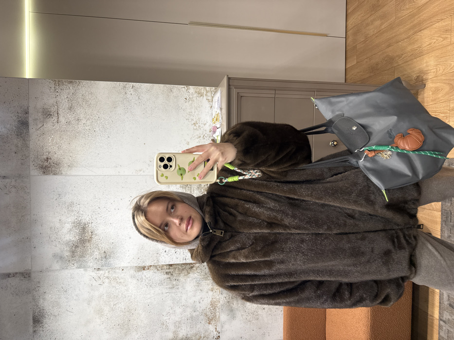 A young adult female is depicted in a mirror selfie taken indoors in Hrodna, Belarus. She has blonde hair, partially covered by a light grey hood beneath a dark brown, oversized faux fur hooded jacket, worn over a black turtleneck and grey trousers. Her right hand holds a cream-colored smartphone, featuring a case with light green abstract designs and a multicolored braided lanyard. Her left hand holds a dark grey fabric tote bag, likely a Longchamp Le Pliage, adorned with a green striped ribbon, a gold-colored charm, and an orange-brown croissant-shaped leather charm. The immediate environment includes a textured wall with a mottled off-white, grey, and brown pattern. To the right, a light beige wardrobe unit with vertical gold handles and a horizontal LED strip light is present, positioned next to a multi-drawer dresser displaying small colorful items. To the left, a portion of an orange upholstered sofa is visible. The floor is light wood-toned.