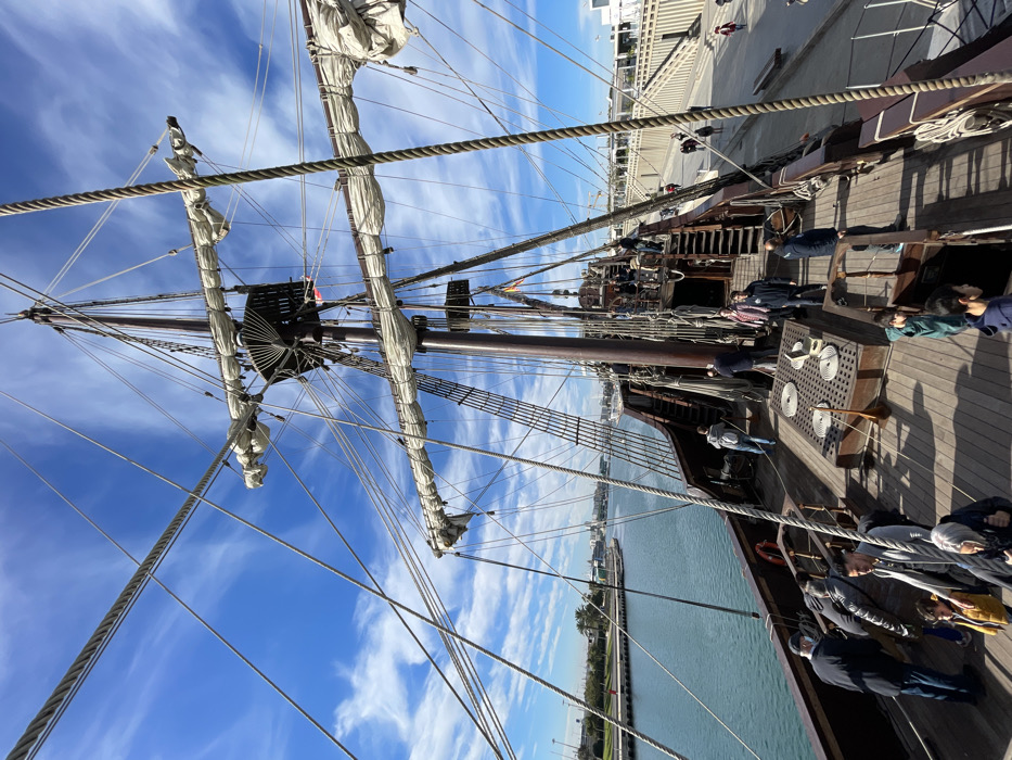 - "The image presents an elevated view from the main deck of a large, multi-masted wooden sailing ship, identified as a historical replica, docked at a port in Valencia, Spain" by FM-AqN2k2, licensed under CC BY 4.0