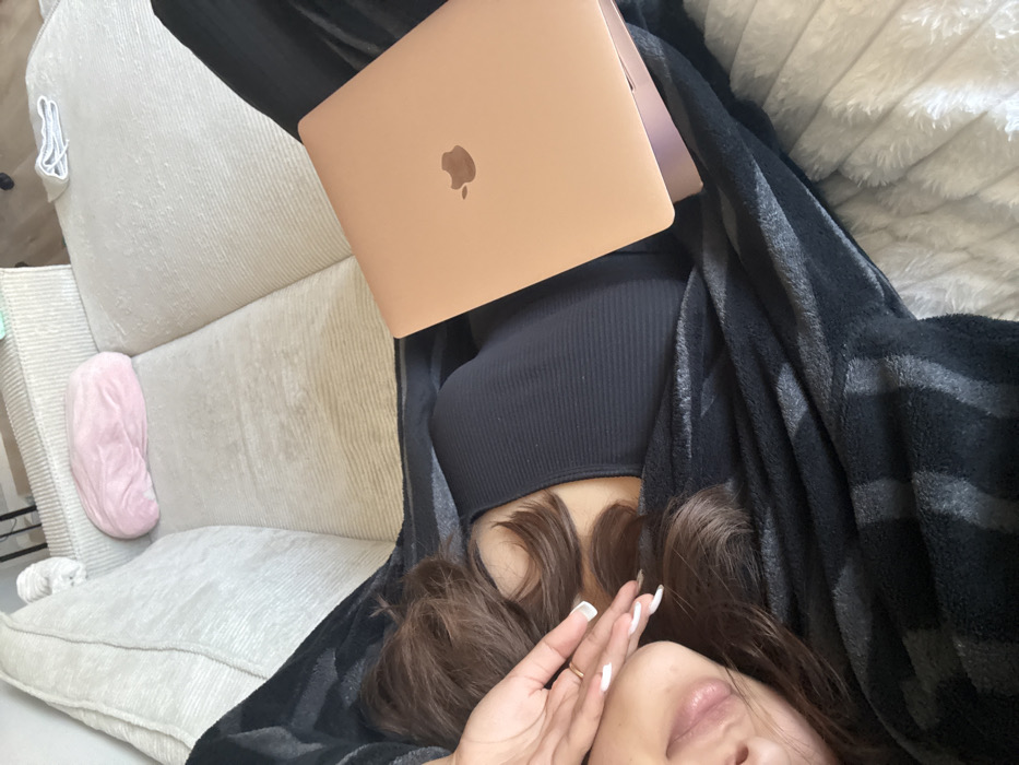 The scene depicts an individual resting on a light beige textured sofa within an indoor residential setting, located in Mönchengladbach, Germany. A person, appearing to be female, with dark brown hair, lies on their back, partially covered by a black and dark grey striped fuzzy blanket. They wear a black ribbed top. Their right hand, featuring long white-tipped nails and a gold ring on the ring finger, is positioned over the lower portion of their face. A closed rose gold Apple MacBook rests on their lap, atop the blanket, with the Apple logo visible. A pink, elongated cushion is placed on the sofa's backrest. A light-colored floor and a folded white cloth are visible in the background.