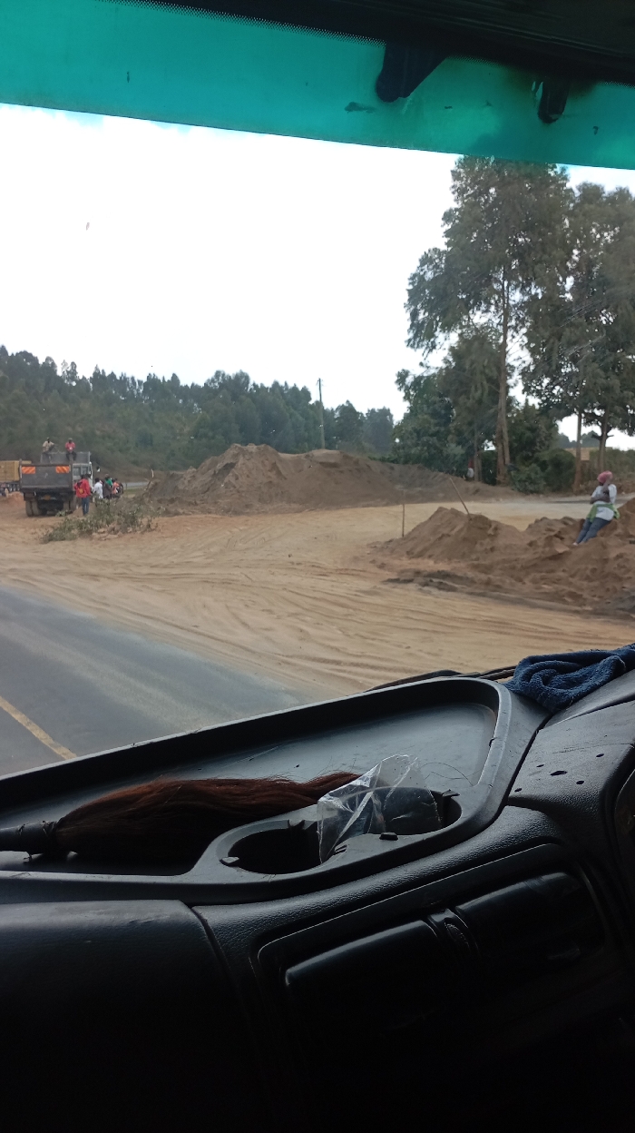 The image, viewed from a vehicle's interior, depicts a roadside scene in Limuru Central ward, Kenya, dominated by earthworks and sand deposits