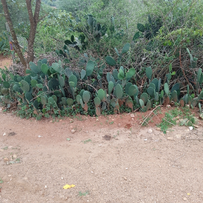The image depicts an unpaved outdoor area with a natural barrier of vegetation. The foreground consists of a light brown dirt path or unpaved road, showing scattered small stones and minimal dry debris, including a single small yellow leaf on the left side of the path. Immediately behind the path, forming a distinct boundary, is a dense and continuous row of *Opuntia* (prickly pear) cactus plants, characterized by numerous flat, green, oval-shaped pads varying in size and height, primarily in shades of dark green and bluish-green. Some smaller green leafy plants are intermingled at the base of the cacti in reddish-brown soil. Behind this cactus line, a thick expanse of diverse green foliage is visible, including trees with exposed trunks and branches, and additional, larger cactus plants. In the upper background, a vegetated hillside rises gently. No individuals are present, and no actions or interactions are observed. The location is in the city of Unknown, Unknown.