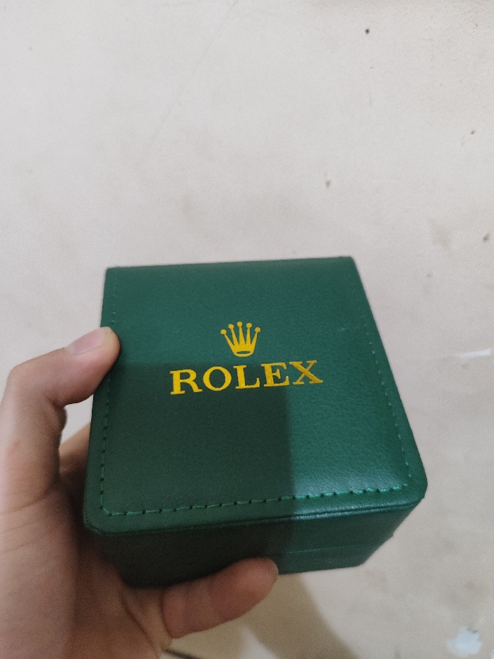 - "A hand holds a dark green, square box with the brand name "Rolex" emblazoned in gold lettering, surmounted by a gold crown logo" by FM-BLGhx1, licensed under CC BY 4.0