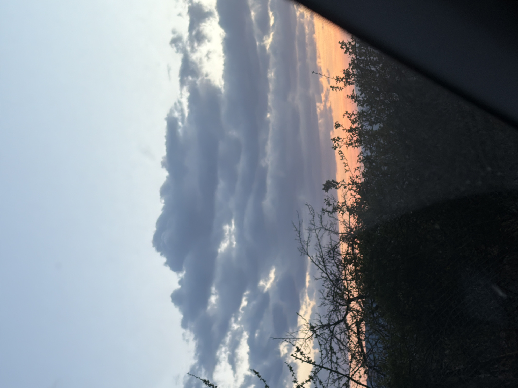 cloudy sky at sunset, possibly from inside a vehicle. The colors range from light blue to grey to orange. A tree line is visible on the right, silhouetted against the orange sky. The location is unknown as it's not clear in the image.