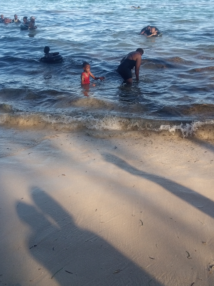 The image depicts a beach scene in Shanzu ward, Kenya. The foreground consists of light-colored, wet sand with distinct, elongated shadows stretching from the lower left to the upper right, indicative of a low sun angle. A small breaking wave marks the water's edge, where scattered organic debris is visible on the sand and within the water. A total of at least nine individuals are present in the water. In the immediate midground, an adult female wearing a dark, possibly one-piece, garment is bent forward at the waist in mid-thigh to waist-deep water. To her left, a young child wearing a red top stands in chest-deep water with their right arm slightly extended. Further into the water, a child is partially submerged while utilizing a black inflatable swim ring. A group of at least three additional individuals, including one prominently using a black inflatable swim ring, are partially submerged in the midground water on the left. On the right midground, two individuals are partially submerged, one with a black inflatable swim ring. A single head is visible in the distant background water. The water surface exhibits gentle ripples and contains floating organic debris.
