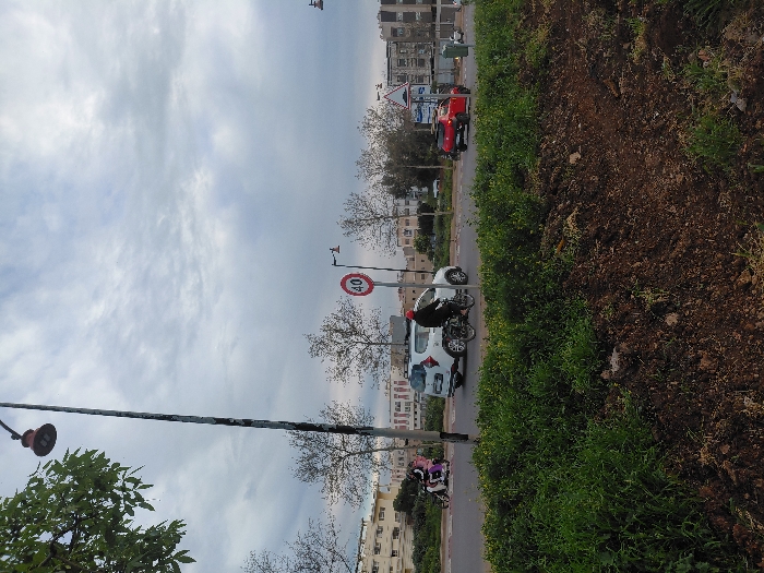 The image depicts an urban street scene in the city of Fez, Morocco, observed from a slightly elevated position. In the immediate foreground, a mound of dark brown soil is partially covered with patches of vibrant green weeds and grass. Beyond this, a paved multi-lane road is visible, featuring a central median strip planted with sparse trees and low vegetation. Traffic on the road includes a white SUV, possibly a Dacia Duster, traveling from left to right. Parallel to the SUV, a male cyclist wearing a dark jacket and a red cap rides a dark bicycle in the same direction. Further down the road, a red compact car, possibly a Renault Clio or Captur, is visible. On the far left, a purple or pink scooter with two riders is partially obscured, also moving from left to right. Street infrastructure includes a tall, weathered grey street light pole with a reddish-orange luminaire prominent in the upper left. A circular red-bordered speed limit sign displaying "40" (kilometers per hour) is located on a pole within the central median. A triangular warning sign with a red border is also visible further along the median. In the background, beyond the road and trees, several multi-story buildings with light-colored facades are visible under an overcast sky with scattered grey clouds. The trees in the scene have minimal foliage, suggesting a season other than full summer.