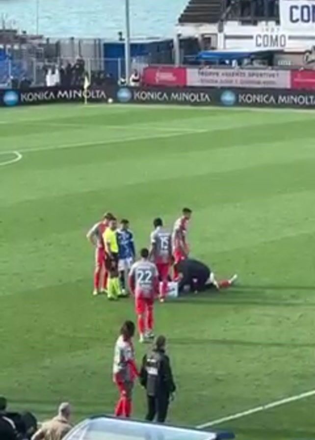 soccer game where a player is lying on the field, receiving medical attention