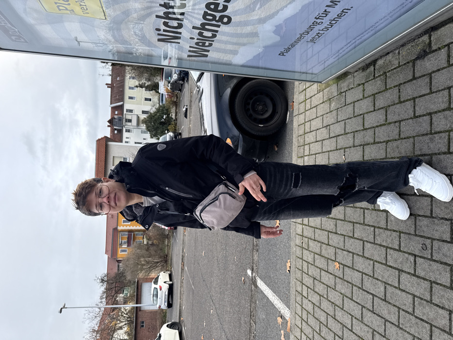The image displays an urban scene in Riesa, Germany, under an overcast sky. A single individual stands on a grey paver sidewalk, positioned slightly right of center, looking directly at the camera. The person has short, light brown hair and wears clear-framed glasses, a black hooded winter jacket over a light grey long-sleeved shirt, dark grey ripped jeans, and white sneakers. A light grey fanny pack is worn across the chest, and a ring is visible on the left ring finger, with the left hand partially in a jeans pocket. To the right of the individual, a large, illuminated display case or billboard is partially visible, featuring German text that includes "Nichts Weichges" and "Plakatwerbung für Mi Jetzt buchen." The ground around the individual is a grey brick-patterned sidewalk with scattered brown leaves. Behind the individual, an asphalt parking lot contains several vehicles, including a black sedan with a black steel wheel partially visible immediately behind the person. Further back and to the left, a white hatchback is parked. A dark street light pole stands on the left side of the parking lot. In the background, multiple multi-story residential buildings of varying colors (yellow, white, and brick) are visible, along with bare deciduous trees and some shrubbery.