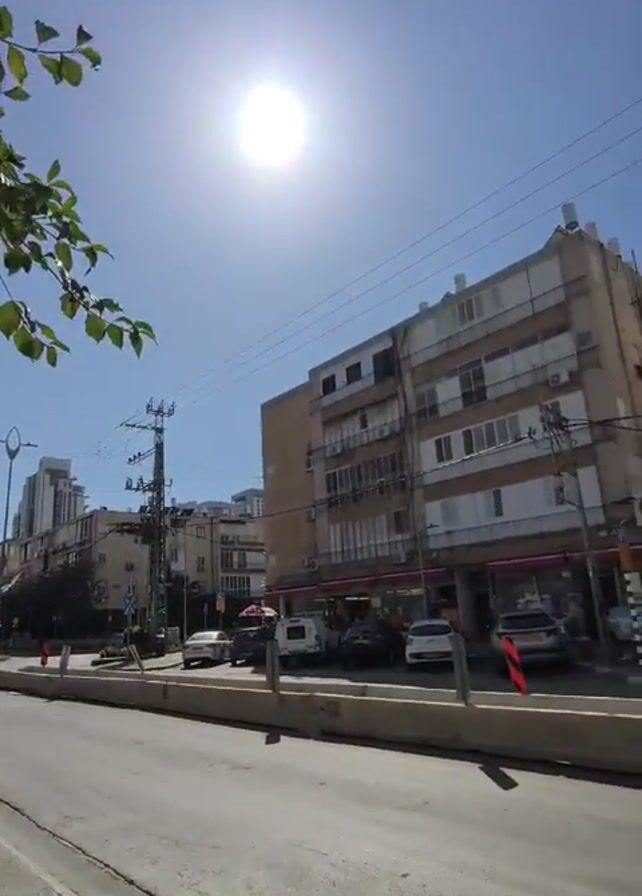 sunny street scene in an urban area. The camera is held by someone walking along a sidewalk. On the left, there's a line of parked cars and then the street, with traffic moving away from the viewer. Buildings line the street, varying in height and architectural style. Some buildings have shops on the ground floor. A large amount of utility poles and wires crisscross above the street. The sky is clear and blue, with the sun brightly shining. There is the sound of an ambulance siren.