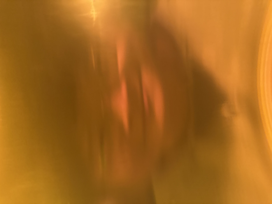 A hazy, blurred image dominated by golden-brown tones. Vertical streaks and indistinct shapes suggest a possible face or figure in the center, although details are obscured. Light flares are present, contributing to the overall soft, dreamlike quality of the image. The lack of sharp focus makes definitive object recognition difficult. A circular pattern with orange hints appears on the right edge.