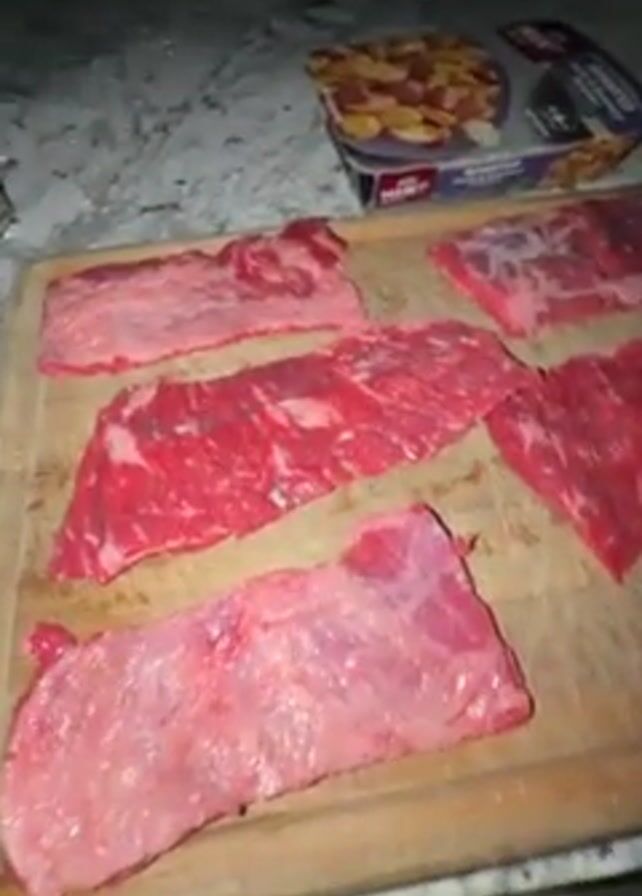 person preparing food on a countertop. There are several cuts of raw beef on a wooden cutting board and a metal tray. The person is seen touching the meat. A package of roasted potatoes and a container of sliced strawberries are visible on the countertop. The countertop has a speckled granite-like surface. The lighting in the video is dim.