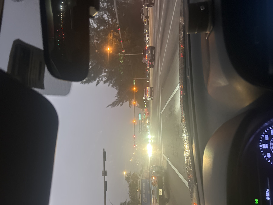 The image presents a wet, overcast street intersection at NW 97th Ave and NW 20th Street in Doral, Florida, United States, viewed from the driver's seat of a stationary vehicle. Raindrops are visible on the vehicle's dashboard and windshield, indicating recent precipitation. The foreground shows the top of the dashboard, a portion of the steering wheel and instrument cluster displaying "327mi," a lowered sun visor on the left, and a rearview mirror on the right reflecting distant lights. A dark cylindrical object is affixed to the right side of the dashboard. In the midground, multiple vehicles are stopped at the intersection, illuminated by their headlights and streetlights. Traffic lights on the left display red, while those on the right are amber. A light-colored SUV with "FREE INSPECTIONS" written on its rear is visible in the left lane. Overhead street signs confirm the intersection as "NW 20 ST" and "NW 97 AVE," with a more distant green sign partially obscured by atmospheric haze. The background features palm trees on the left and dense dark foliage on the right. No individuals are discernible within the frame. The overall scene suggests an urban setting during evening or early morning hours with low visibility conditions due to the weather.