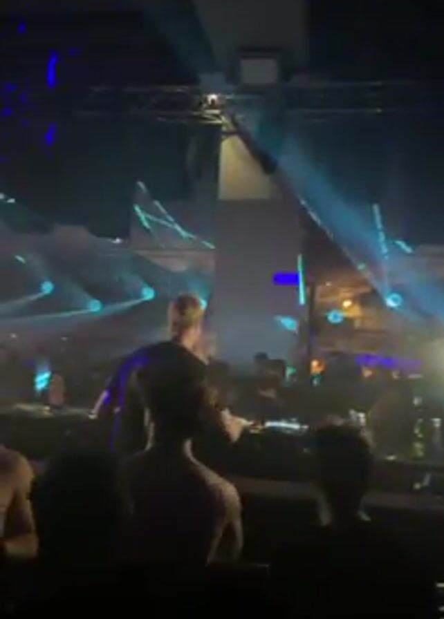 DJ performing at a nightclub. The DJ is blonde and is wearing a black t-shirt. They are standing behind a DJ console with various pieces of equipment. The console is in the center of the frame, and behind it is a crowd of people. The crowd is mostly made up of young adults, who are dancing and enjoying the music. The lighting in the club is dark, with blue and green laser lights illuminating the scene. A pillar is placed directly behind the DJ. The camera is positioned behind the crowd, giving a view of the DJ and the dance floor. The overall atmosphere is energetic and lively.