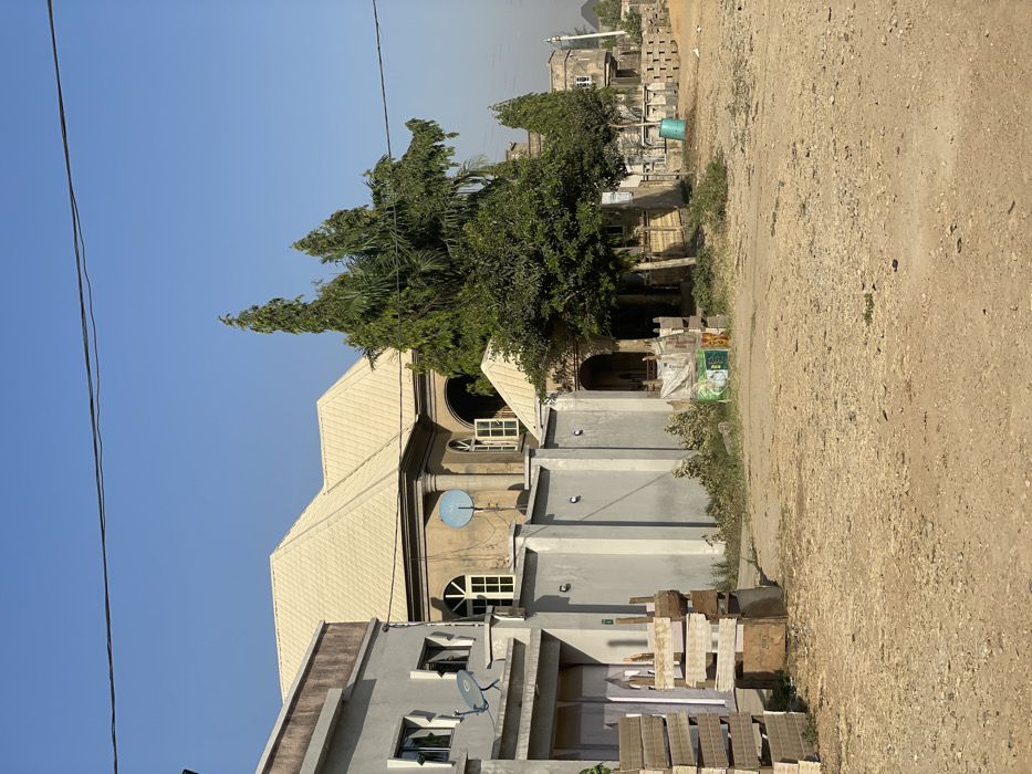 A two-story building with a light tan roof is partially obscured by a tall, leafy tree. A grey wall and arched entryway extend to the right, with various items stacked nearby. In the foreground, a smaller grey building with a satellite dish is visible. A stack of rectangular objects sits in front. The dirt road to the right takes up a significant portion of the frame. Blue sky and power lines are visible in the upper left.