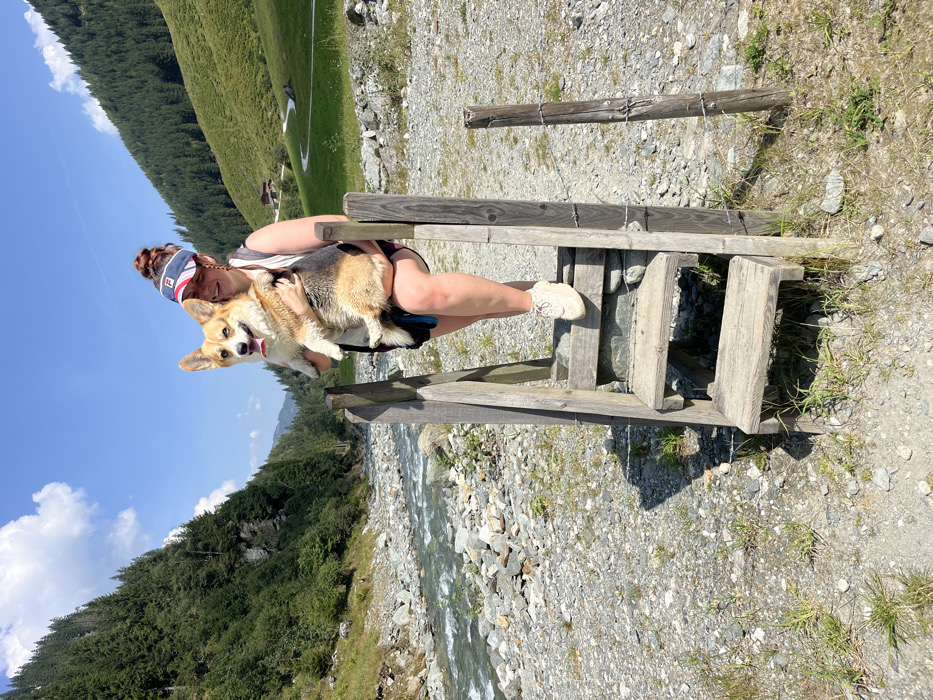 - "The image depicts a female individual holding a Pembroke Welsh Corgi dog, standing on a weathered wooden stile with three steps, in a mountain valley near Reitlehen, Austria, on a clear, sunny day" by FM-4GKkh1, licensed under CC BY 4.0