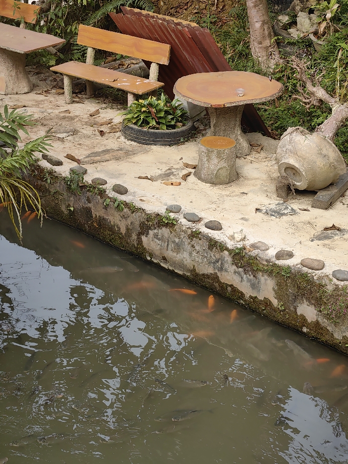 This image depicts an outdoor recreational area in Mù Cang Chải, Vietnam, situated alongside a narrow water channel. The scene is devoid of people. In the lower portion of the frame, a murky, greenish-brown water channel contains numerous fish, including several bright orange specimens and multiple darker, greyish-brown fish actively swimming. The channel is bordered by a concrete retaining wall, partially covered with green moss and small plants. Along the top edge of this wall, a linear arrangement of smooth, dark river stones is visible. Above the retaining wall, a light-colored, possibly concrete or paved ground is scattered with dry brown leaves. On this surface, a seating arrangement is present, comprising two concrete tables with reddish-brown, wood-simulating tops and two matching concrete benches with similar finishes. A smaller, tree-stump-shaped concrete stool with a reddish-brown top is positioned near one of the tables, which bears a small, clear, cylindrical object. A black tire repurposed as a planter holds green foliage between the furniture pieces. To the right, a large, weathered, light-colored ceramic or concrete urn lies horizontally, supported by two wooden planks. The background consists of dense green vegetation, including tree trunks and ferns, with several sheets of reddish-brown corrugated metal stacked vertically against it. The scene is illuminated by natural daylight.