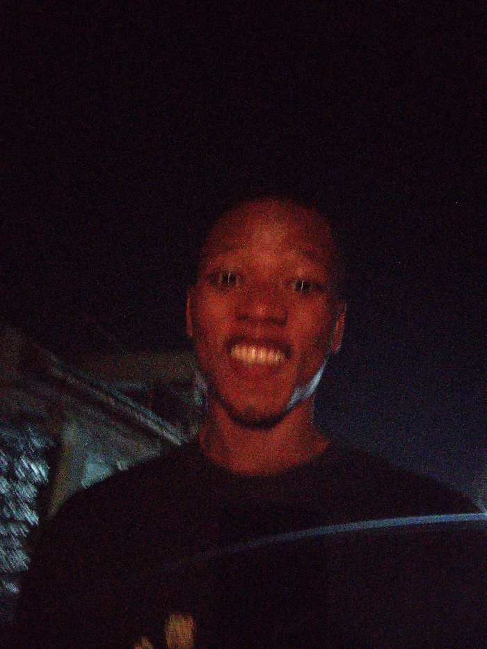 The image displays a single individual, identified as an adult male, captured from the chest up in a low-light, grainy setting. The subject, positioned centrally, has a dark complexion and is wearing a dark, possibly black, crew-neck shirt. He presents a broad, open-mouthed smile, revealing a full set of upper teeth. His eyes are open and directed towards the camera. Illumination appears to originate from the front, highlighting the subject's face and creating a subtle sheen on the right side of his jawline. The background is predominantly dark and indistinct, with blurry, unidentifiable structural elements faintly visible in the lower-left portion of the frame. The scene is characterized by significant image noise due to the low light conditions. This event is stated to occur in Ogbomosho, Nigeria.