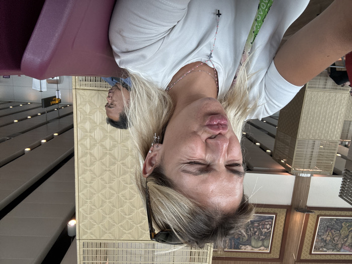 A woman with blonde hair pulls a funny face, eyes squinted and lips pursed, wearing a white shirt and silver necklace with a cross pendant. She has earrings and sunglasses tucked behind her ear. In the background, an older man's face is visible in a reflective panel, and rows of seats stretch into the distance. Decorative panels with paintings and cage-like structures hang from the ceiling. A burgundy chair is also partially visible.
