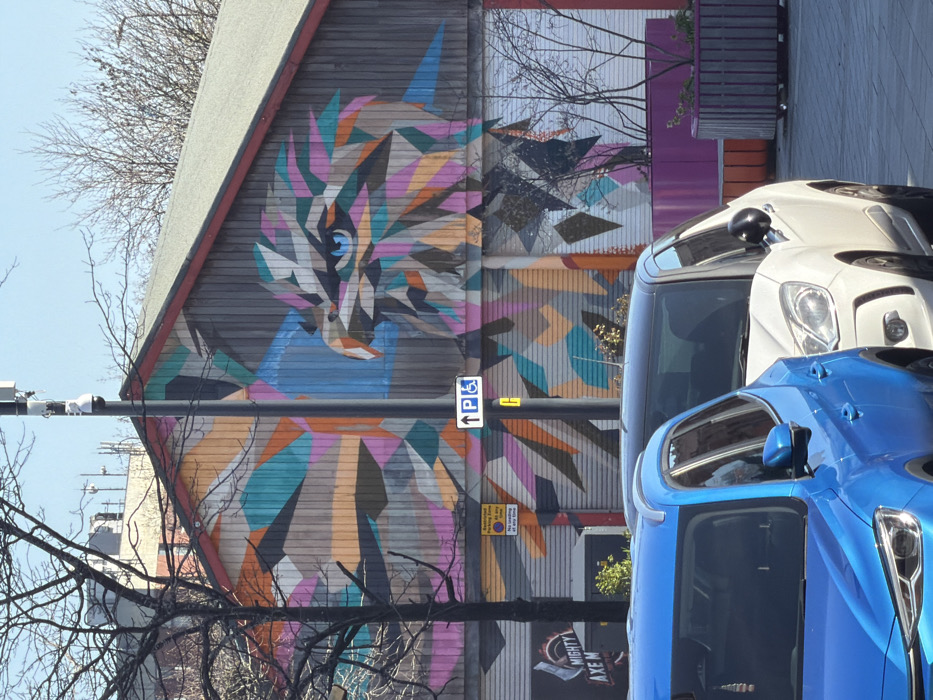 The image displays an outdoor urban scene in Crewe, United Kingdom, specifically depicting the side of a building identified as the former Crewe Market Hall, now part of the Crewe Lifestyle Centre. The building's facade is dominated by a large, geometric mural of an eagle's head in profile, facing right. The mural is composed of numerous irregular polygons in varied colors, including teal, orange, pink, purple, grey, black, and white, with the eagle's eye rendered in blue. Below the mural, sections of roll-down security shutters are visible, one featuring a partial sign reading "MIGHTY AXE M[E]". In the foreground, two parked vehicles are partially visible: a blue SUV/crossover on the left and a white compact car on the right, both oriented away from the viewer. A tall, dark grey utility pole stands centrally, equipped with a CCTV camera and communication antennas. Attached to this pole is a white rectangular sign indicating disabled parking with an upward arrow. To the left of the pole, a "Restricted Parking Zone" sign is visible, stating "AT ALL TIMES / No loading at any time." A leafless tree with dark branches partially obscures the mural on the left. On the right, purple and grey wooden planters contain sparse, leafless shrubbery. The background shows a clear blue sky. No individuals are present in the scene.