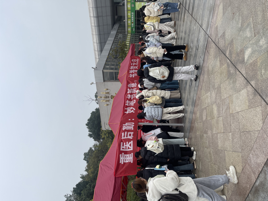A long queue of people, mostly wearing casual jackets and carrying bags, stand under a red tent bearing Chinese characters