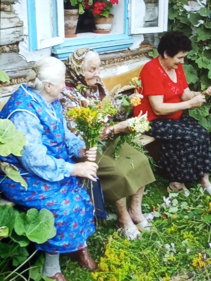 Three women are depicted outdoors in Wojnowice, Poland, situated on a low wooden bench or platform against a weathered, light-colored wooden building facade. An open window with distinct blue trim and white sashes is visible in the background, showcasing two potted red geraniums. From left to right: 1. An elderly woman with light-colored hair styled in a bun, wearing a long-sleeved blue dress with a red floral pattern, holds a bouquet of yellow and green wildflowers. Her feet are clad in white socks and brown closed-toe shoes. She is looking towards the center woman. 2. An elderly woman wearing a patterned headscarf, a patterned long-sleeved top, and an olive-green skirt. She is actively engaged with a collection of yellow and white wildflowers in her hands. Her feet are in white slip-on sandals. 3. A woman with dark, short curly hair, wearing a red short-sleeved top and a dark patterned skirt. She is handling green foliage. Her feet are in white slip-on shoes. The ground around the women is covered in green grass and scattered wildflowers, predominantly yellow. Large green leaves are visible in the foreground on the left and also along the right side of the image, suggesting a lush, natural environment. The scene is illuminated by natural daylight.
