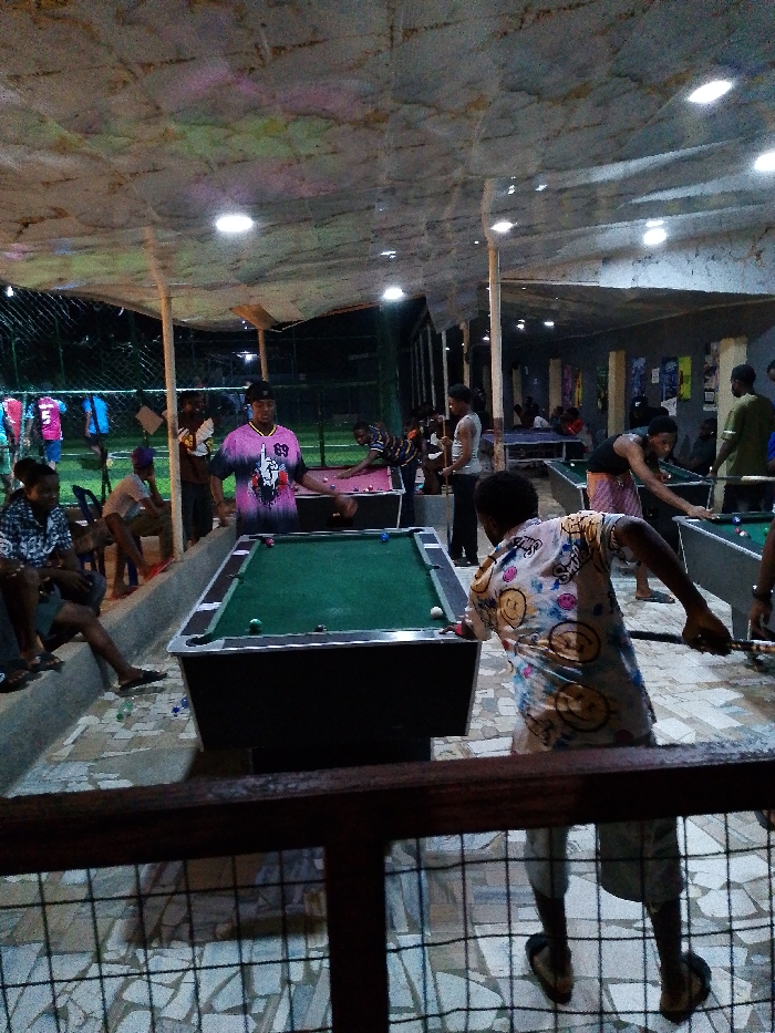 A group of people is gathered around several pool tables in an outdoor recreation area. Some are playing pool while others watch or socialize. The tables are positioned under a makeshift roof supported by wooden posts, with bright lights illuminating the scene. Several people are seated to the side, and clothing is hanging on a line in the background. The ground has a mosaic tile pattern.