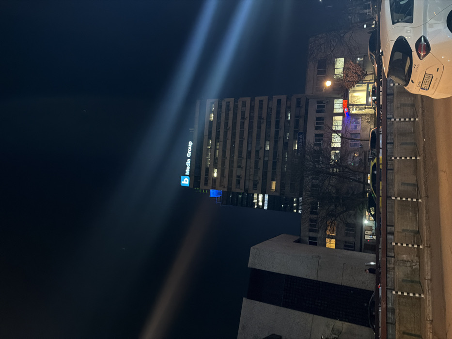 The image presents a nighttime urban scene in Sofia, Bulgaria, specifically depicting the area around the National Palace of Culture (NDK) and the Trade Center "Europe" building. The Trade Center "Europe" is the dominant structure in the central and right portions of the frame, a tall, multi-story building featuring an illuminated blue "b Media Group" sign at its apex and a "Postbank" sign on a lower floor. Its facade is light-colored, with numerous rectangular windows, some of which are illuminated. To the left, a section of the National Palace of Culture is visible, characterized by a distinctive light-toned concrete facade with a dark, vertical recessed panel. In the foreground, a street runs horizontally, separated by a concrete barrier with black and white striped marker posts. Several vehicles are present: a white Renault Zoe electric car with Bulgarian license plate CA 9359 AA is parked on the right, facing away from the viewer. Other vehicles, including a dark sedan and a yellow car, are visible further down the street. Two indistinct human figures are discernible on the sidewalk near the National Palace of Culture building. Bare trees are situated between the street and the buildings. The scene is illuminated by artificial light sources from the buildings and streetlights, with lens flares visible in the dark night sky.