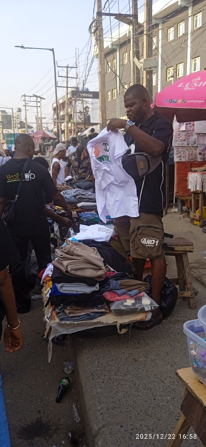 This image depicts a bustling outdoor street market scene on a busy commercial street within Ikeja, Lagos State, Nigeria. The timestamp on the image indicates 2025/12/22 16:58. In the foreground, a dark-skinned male individual, approximately mid-adult, is central to the composition. He wears a dark short-sleeved polo shirt, dark brown cargo shorts with an "AND 1 KNOWLEDGE" logo on the left pocket, and dark sandals. A metallic watch adorns his left wrist, and a grey and black fanny pack is worn diagonally across his chest. He is actively inspecting a white short-sleeved t-shirt, holding it up with both hands. The t-shirt features a multi-colored graphic design that includes green, orange, a stylized black 'C' (resembling a Chanel logo), and the word "NEW YORK". He is looking downwards at the shirt. Directly in front of this individual is a makeshift display table covered with a light-colored, coarse fabric, upon which numerous piles of folded clothing items, including t-shirts, shorts, and trousers of various colors and materials, are neatly stacked. A white t-shirt with an "Adidas" logo is visible on top of one stack. To the immediate right of this display, a small wooden stool is visible, and a clear plastic container filled with small, colorful items (possibly accessories) rests on an adjacent wooden stand. To the left of the central figure, a second dark-skinned male, also approximately mid-adult, is seen from behind. He wears a black t-shirt with a green and white "Magic Drip" logo and carries a black shoulder bag. He appears to be either examining or organizing items on another section of the clothing display. Several other indistinct figures are visible in the mid-ground, suggesting a busy pedestrian area with ongoing commercial activity. One person in a white tank top and a light-colored cap is partially visible further left. The ground consists of paved asphalt or concrete, with a noticeable curb separating the merchandise displays from the pedestrian path. A green plastic bottle and other miscellaneous litter are visible on the ground near the curb. The background reveals a typical urban Nigerian streetscape. Numerous utility poles with a dense network of overhead electrical wires dominate the upper portion of the scene. Multi-story commercial buildings with multiple windows line the street. A prominent "Infinix" billboard, featuring a man in a hat, is visible mid-distance. To the right, a vibrant pink umbrella displays "Lush Hair Nigeria" branding along with various social media icons (Instagram, X, Facebook, YouTube, TikTok), indicating another vendor's stall selling beauty products or services. Further down the street, a sign reading "POS" is partially visible. The overall environment is brightly lit by natural sunlight, consistent with the late afternoon timestamp.