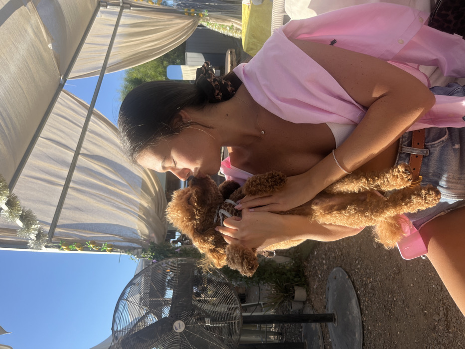 The image portrays a young adult female holding and kissing a small, brown, curly-haired dog in an outdoor setting in Kfar Ruth, Israel