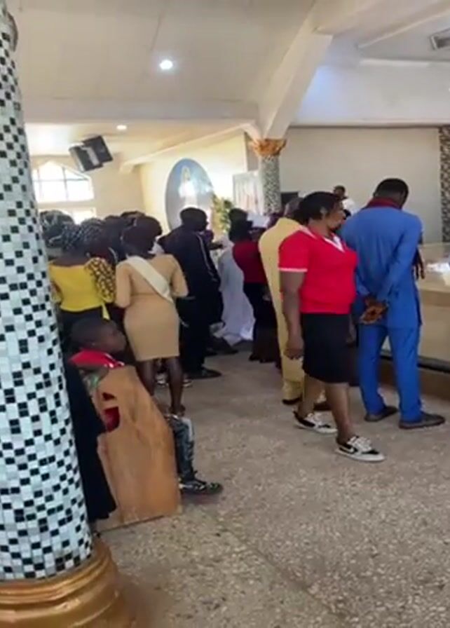 The interior of a church is shown. The walls and ceiling are off-white, and the floor is light brown. There are numerous people inside, most of whom are standing and interacting with one another. They are wearing a variety of clothing in different colors. Several people are wearing red shirts. There are wooden benches with Christian cross designs in the foreground. One person is sitting on a bench. The camera pans around the room.