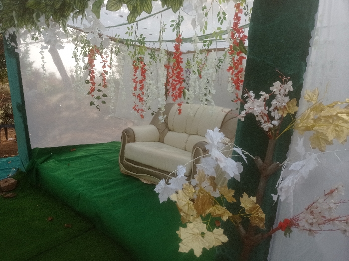 The image displays a decorated outdoor event setup in Ugbongha, Nigeria