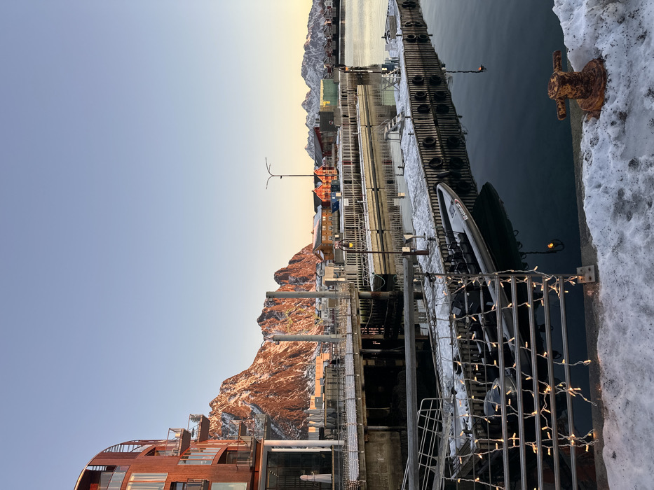 The image depicts a winter waterfront scene in Svolvær, Norway, likely during early morning or late afternoon, under a clear, transitioning sky. In the foreground, a snow-covered embankment is visible, featuring a rusty brown metal bollard on the right and a metal railing with unlit string lights on the left. The calm, dark blue water reflects the adjacent docks and structures. In the midground, multiple wooden floating docks, dusted with snow, extend into the water. A gray Rigid Inflatable Boat (RIB) marked "RIB-Adventure.no," with visible seating and a thin layer of snow, is moored to the leftmost dock. Behind these, an elevated concrete and metal walkway, also partially snow-covered, spans the scene horizontally. Small white outdoor tables and chairs are arranged on this walkway. A streetlamp stands on one of the piers. On the far left, a modern, multi-story building with a distinctive curved, reddish-brown wooden facade and multiple glass-fronted balconies rises prominently. Its ground floor features large glass windows. Further to the right along the waterfront, several traditional red and white wooden buildings with snow-dusted roofs are visible. One individual is discernible walking on the elevated walkway towards the right. The background is dominated by imposing, snow-capped mountains, illuminated by a warm, low-angle sunlight that casts an orange-red glow on their peaks. The sky transitions from a pale yellow-orange near the horizon to a clear light blue overhead. Distant snow-covered peaks are visible across the far right horizon.