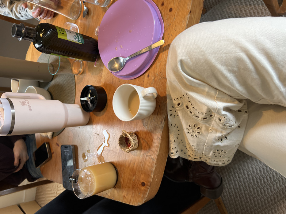 The image displays a cluttered wooden dining table from an elevated perspective, situated in Paris, France. On the table, a large light pink Stanley insulated mug with a handle is central, accompanied by a tall, light-colored opaque thermos and a dark green bottle labeled "Classico Olio Extra Vergine di Oliva." Two smartphones lie face up, one black and one gold-toned displaying the time "4:41." A clear glass holds a light orange-yellow liquid, with a small spill of this liquid evident on the table surface. Nearby, a small black object with exposed blades, likely a blender component, rests. A white ribbed ceramic mug contains a light brown beverage, and a miniature woven basket holds several small red objects. Two stacked purple plastic plates, showing remnants of food, have a silver spoon positioned on the upper plate. In the background, portions of two individuals are visible: one with dark clothing holding a phone, and another with a light-colored patterned sleeve. In the foreground, the legs of a person are visible, wearing light-colored trousers with eyelet embroidery and dark brown shoes, positioned above a light grey patterned carpet.