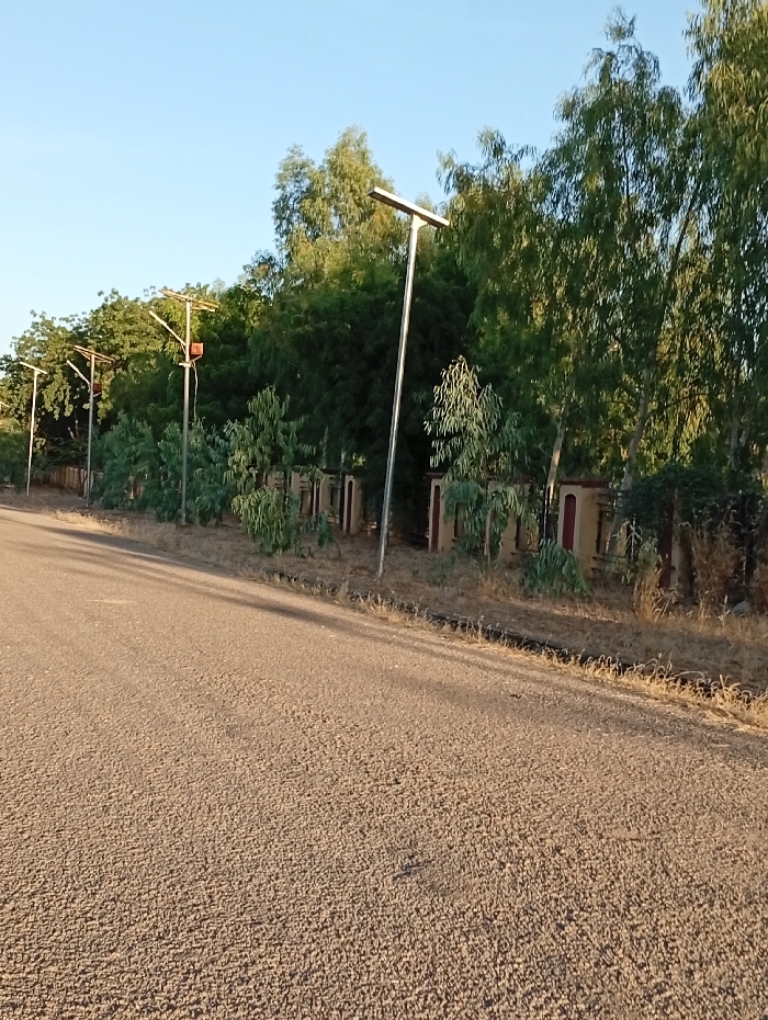 A sun-drenched asphalt road stretches forward. To the right, a mix of trees and shrubs line the roadside. Several silver streetlight poles stand intermittently among the vegetation. Behind the greenery, sections of small, beige buildings with red doors are visible. The sky above is a clear, pale blue. Sunlight casts long shadows across the road surface.