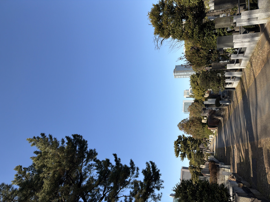 A bright blue sky fills most of the frame. Trees occupy the bottom left corner. A row of headstones borders a narrow road on the right. In the distance, several modern buildings rise above the treeline. The scene conveys a peaceful coexistence of nature, the past, and contemporary urban structures. Shadows cast by trees and headstones stretch across the road.