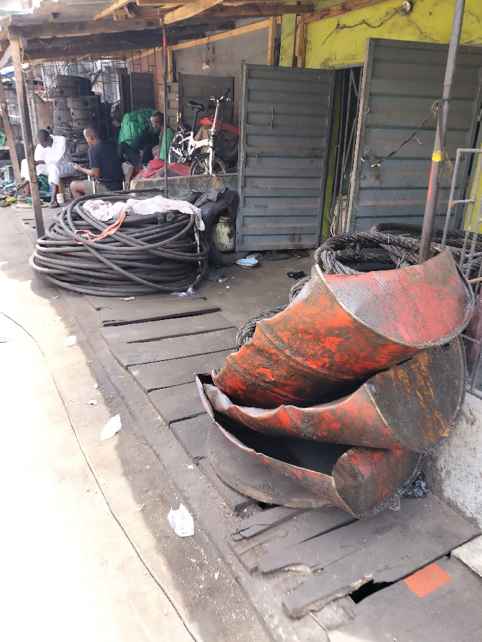 This image displays an outdoor commercial or workshop scene in Alaiyabiagba, Nigeria