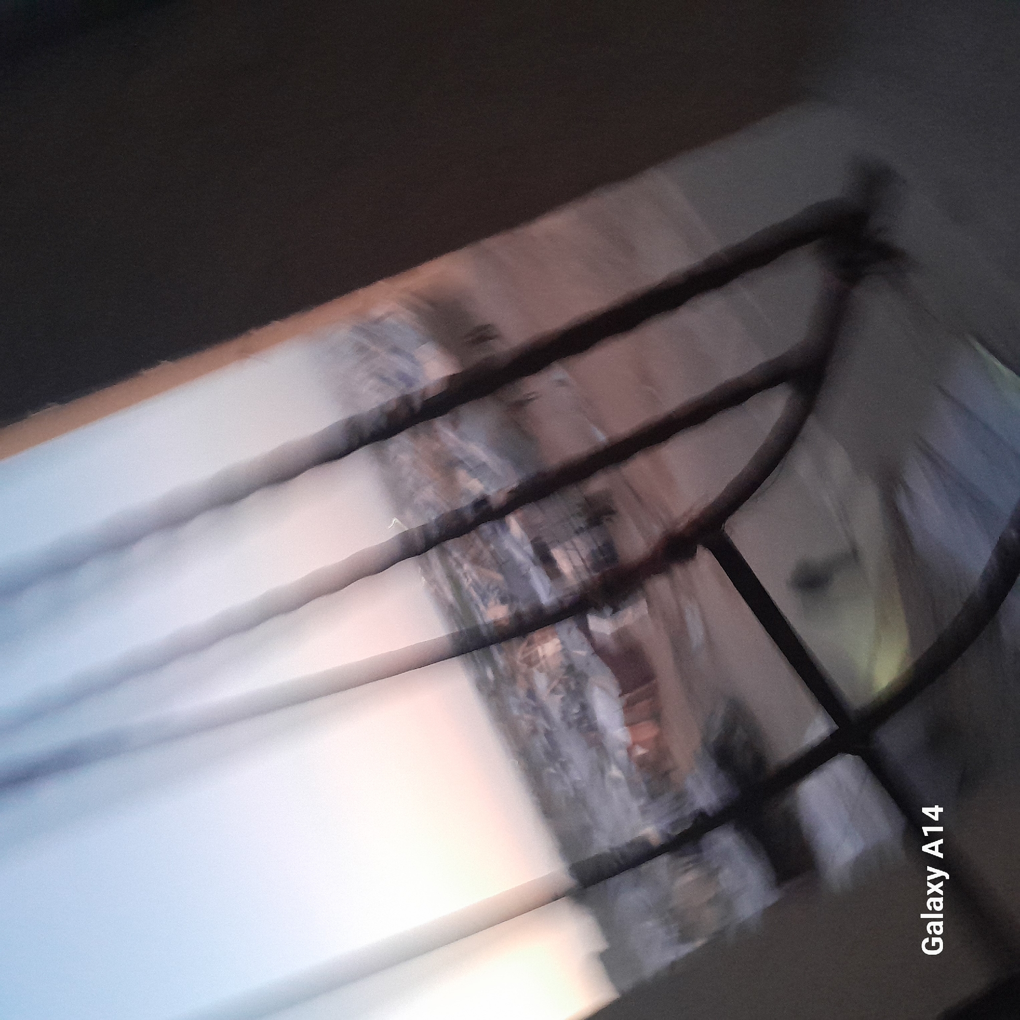 An out-of-focus, rotated image depicting a view from behind a balcony railing. Outside the balcony, a cityscape is partially visible with hues of white, gray, and light peach. The railing is dark and appears to be made of metal. The image includes the text "Galaxy A14." It is not possible to confirm if the image is in the city of Khan Yunis, Palestinian Territory.