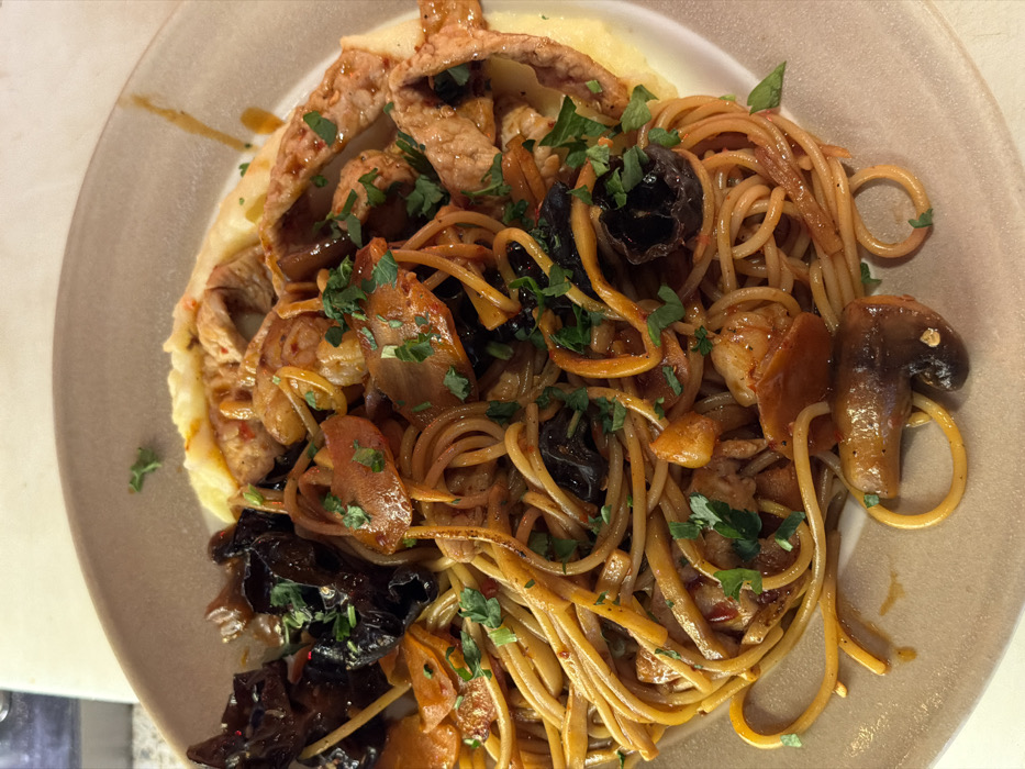 A close-up, top-down image captures a large serving of prepared food on a round, matte light beige plate. The central component consists of spaghetti-style noodles coated in a glossy, reddish-brown sauce, intertwined with various ingredients. These include dark, crinkled pieces of fungi resembling wood ear mushrooms, slices of lighter brown mushrooms, multiple pinkish-orange cooked shrimp, and irregular strips of light-colored meat, consistent with pork or chicken. The entire dish is generously garnished with finely chopped green herbs, likely parsley or cilantro, and scattered red pepper flakes are visible. In the upper right section of the plate, a portion of the meat lies partially atop a creamy, pale yellow substance, consistent with mashed potatoes or polenta, with a streak of the main sauce extending onto it. The immediate background is out of focus, suggesting an indoor setting with a light-colored surface visible in the upper left corner. There are no identifiable landmarks, signage, or specific visual cues within the image to determine a precise location in Sofia, Bulgaria.