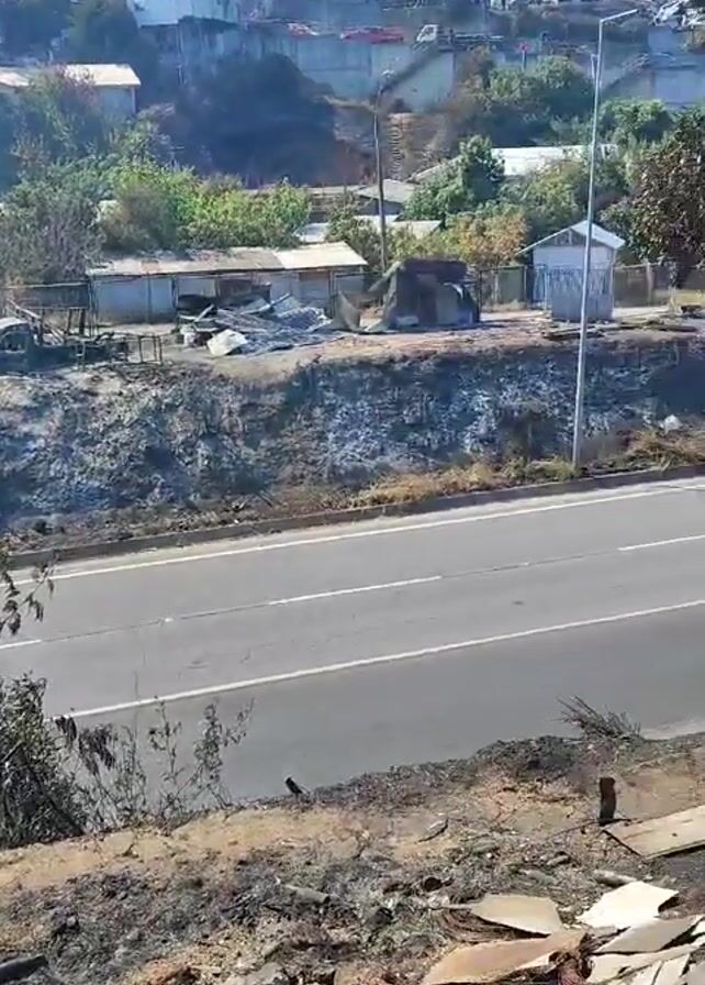 scene after a fire. The foreground is covered in ash and debris. A two-lane road runs horizontally across the middle of the frame, separating the foreground from a more distant area with burned structures and vegetation. On the far side of the road, there are remnants of what appear to be destroyed buildings, including charred metal and debris. Smoke rises from the area. In the background, a hillside is visible with more buildings, some of which appear to be intact, while others show signs of fire damage. There are trees, some burned and some still with leaves, scattered throughout the landscape. A road sign is visible in the distance. A burned-out vehicle is visible in the right foreground. The sky is clear and the overall impression is one of destruction and loss.