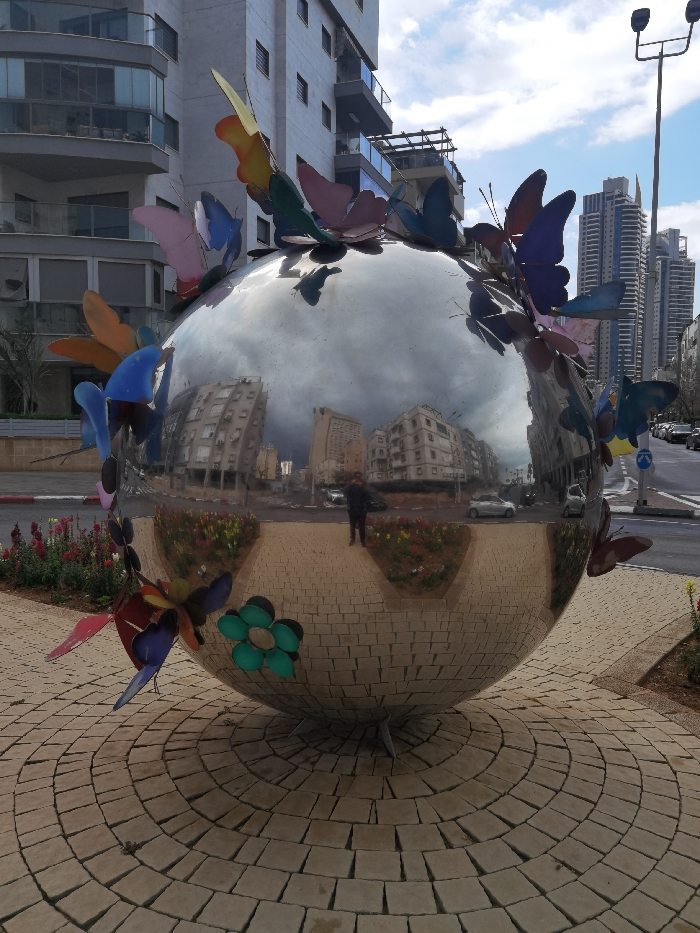 This image displays a large, spherical, highly reflective metallic sculpture situated in an urban environment in Bat Yam, Israel