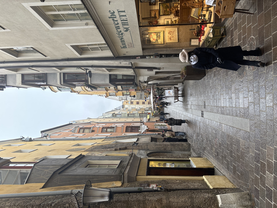 This image captures a view down Seilergasse, a narrow, wet cobblestone pedestrian alley in the Altstadt (Old Town) of Innsbruck, Austria, on an overcast day. The scene is dominated by multi-story historic buildings with traditional architecture, including numerous bay windows and small balconies, lining both sides of the street. Building facades display varying hues of yellow, orange, beige, and grey. The cobblestone street surface is visibly damp, reflecting the overhead light, and a lighter-colored stone strip runs down its center. In the immediate foreground, a person stands with their back to the viewer, positioned on the right side of the alley. They wear a dark long coat, dark pants, dark gloves, and a light-colored fuzzy bucket hat over a white hooded sweatshirt, facing away from the camera and looking down the street. To their immediate left, occupying the right side of the street, is the storefront of "Kunstgewerbe SCHETT." Its large display window exhibits a variety of decorative arts, including framed paintings (floral, landscape, and figurative), religious figurines, small sculptures, and other antique or artisanal items. A dark planter box and a wooden crate are also visible near the storefront. Further down the alley on the right, an outdoor seating area with a white umbrella, a table, and two chairs is visible. On the left side of the alley, a shop entrance with an illuminated interior displays items, and a dark lamppost is affixed to the building facade. Several pedestrians are distributed in the midground and background. A small group of 3-4 individuals congregates near a shop on the left side, one wearing a light brown jacket. Another person in a dark coat walks towards the foreground in the center of the alley. Distant, blurred figures indicate further pedestrian activity deeper into the alley. The overall atmosphere is cool and damp, consistent with an overcast day in a historic European urban setting.
