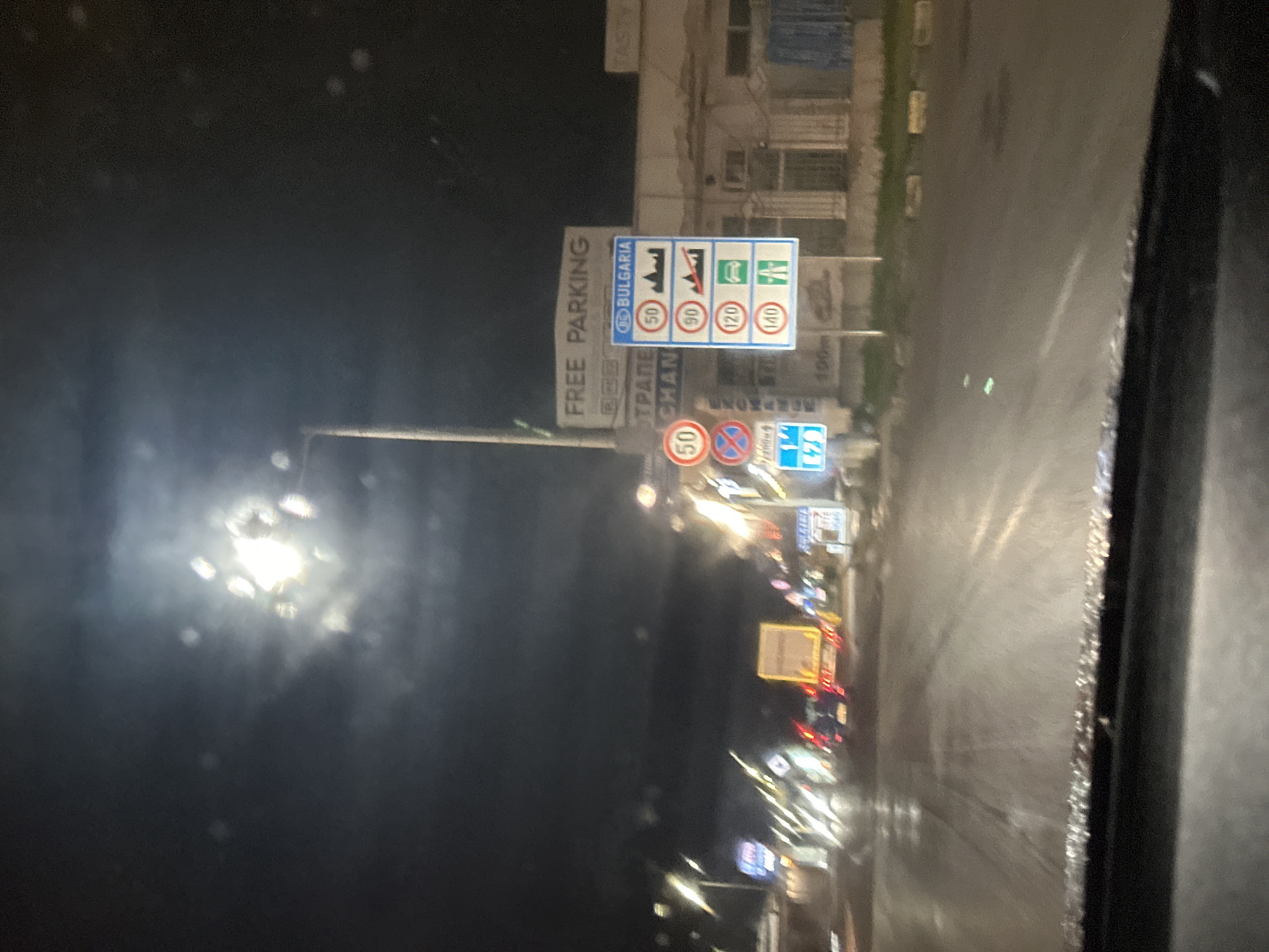 The photograph shows a view from inside a vehicle at night, focusing on road signage in Kulata, Bulgaria. A sign indicating "FREE PARKING" is visible. Adjacent to it is a sign specifying speed limits within Bulgaria: 50 km/h for certain vehicles or conditions, 90 km/h generally, 120 km/h on highways, and 140 km/h on motorways. A 50 km/h speed limit sign is also present below. Further signage includes a blue rectangular sign with a number 79, likely indicating a route or distance. Other signs are partially visible. Streetlights illuminate the scene, and the road surface appears wet, suggesting recent or ongoing rain. The image is taken from within a vehicle, with a portion of the vehicle's interior visible in the foreground.